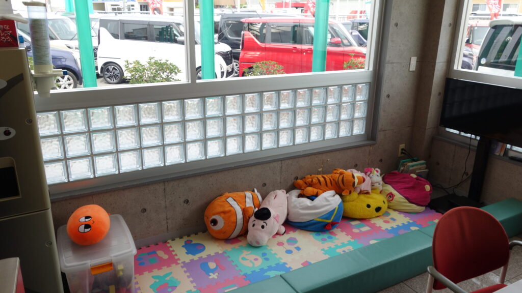 取材中、店内に目をやると、カラフルなジョイントマットの上にぬいぐるみが並ぶキッズコーナーがありました。ファミリー層が多いことを示す、さりげない気配りです。「お子さん連れで来られる方が多いので」と大友店長。子育て世代が安心して相談できる空気感も、この店の強みのひとつです。